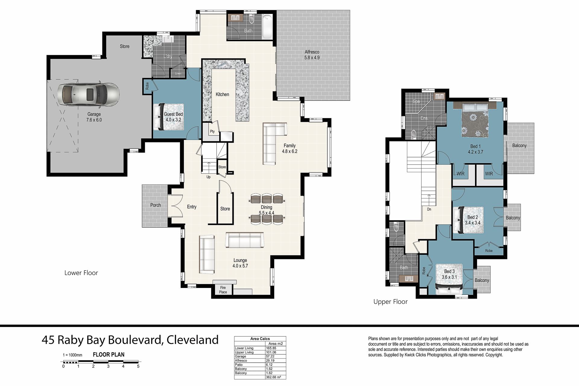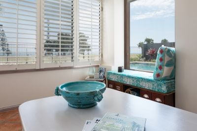 Upstairs are three generous bedrooms, all with built in robes and balconies to take in the North facing bay views. The master bedroom offers a "his and hers" walk in robe, along with ensuite which includes bath, shower and toilet. There is also a family bathroom with shower and vanity along with separate toilet to service the other two bedrooms.